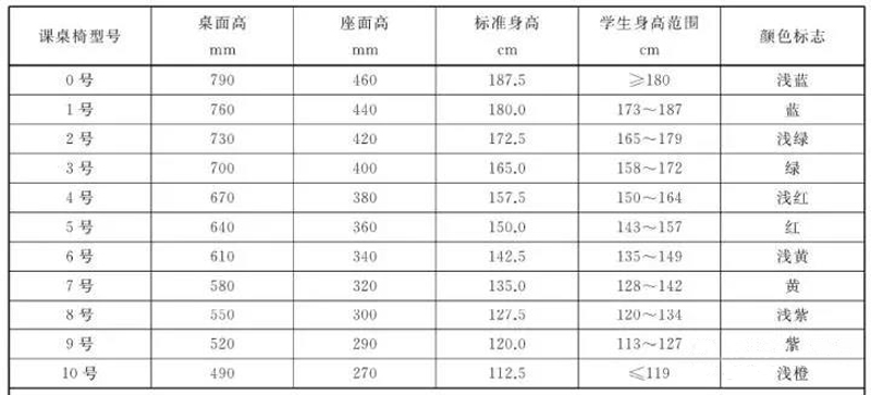 1998 年我國衛(wèi)生部頒布了《學校課桌椅衛(wèi)生國家標準》,確定了9類不同身高的學生使用的桌椅高度標準。2003年,國家質檢總局又頒布《學校課桌椅功能尺寸標準》,根據不同身高確定了10類桌椅高度標準,各型號配備給不同身高的使用者。一個型號課桌椅身高跨度為14厘米,相互交叉,其中最低為49厘米(小學低年級),最高為76厘米(高中)。最大型號的課桌適用于身高在170厘米以上的學生。