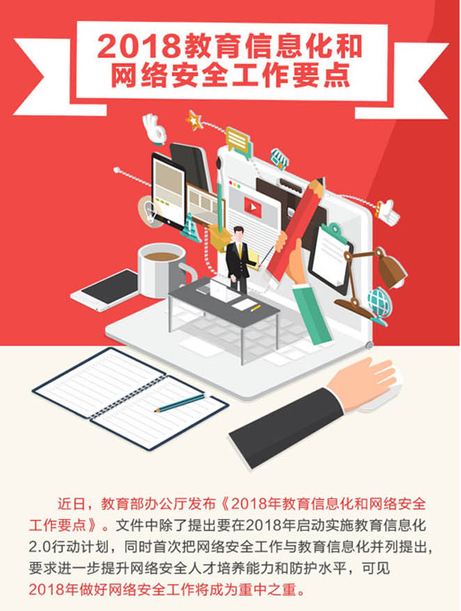 2018年2月教育部發(fā)布的《2018年教育信息化和網(wǎng)絡(luò)安全工作要點》:做好教育信息化統(tǒng)籌部署、完善教育信息化基礎(chǔ)環(huán)境建設(shè)、深化數(shù)字教育資源開發(fā)應(yīng)用與供給服務(wù),以達到實現(xiàn)教育信息化轉(zhuǎn)段升級的目的,充分發(fā)揮“互聯(lián)網(wǎng)+教育”對教育現(xiàn)代化的支撐和引領(lǐng)作用。