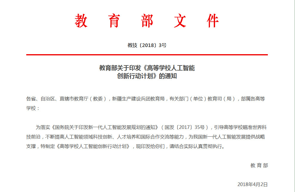 教育部4月份出臺的《高等學(xué)校人工智能創(chuàng)新行動計劃》,引起教育界以及全社會的高度關(guān)注。