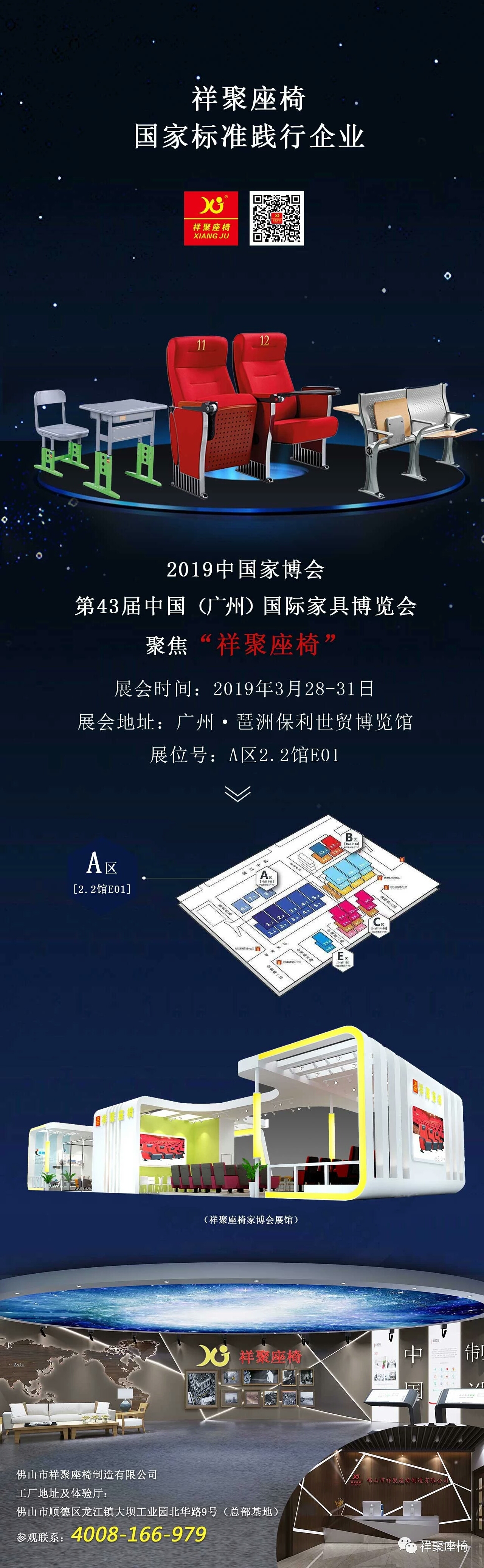 祥聚座椅榮幸受大會之邀,參與即于2019年3月28日至31日在廣州琶洲保利世貿博覽館舉行的第43屆中國(廣州)國際家具博覽會,展位號是2.2館E01。在這個歷時4天的國際家具盛宴中,我們更能多維度、多角度的接觸認識智能家具。