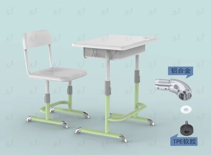 課桌椅選用鋁合金和TPE軟膠材料護腳,防沖撞、耐磨損,穩定防滑,防止地面過度摩擦,用心呵護學生的健康安全,守護學生的教學環境。