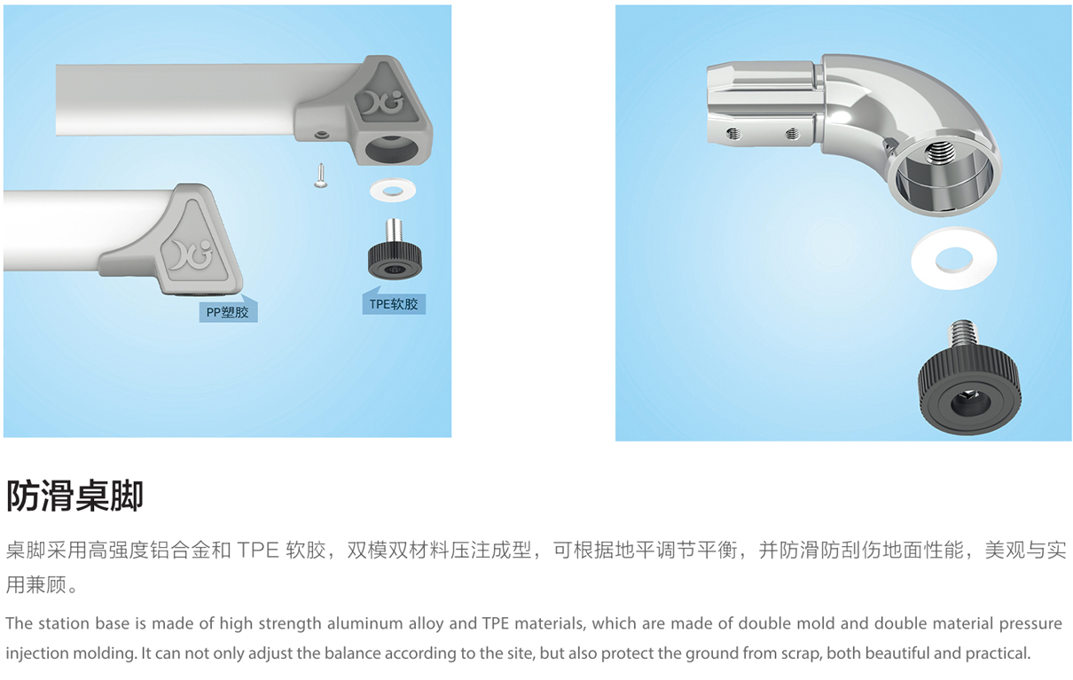 5.桌腳掌:1.5mm壁厚,腳套底有4個平衡調節機構。