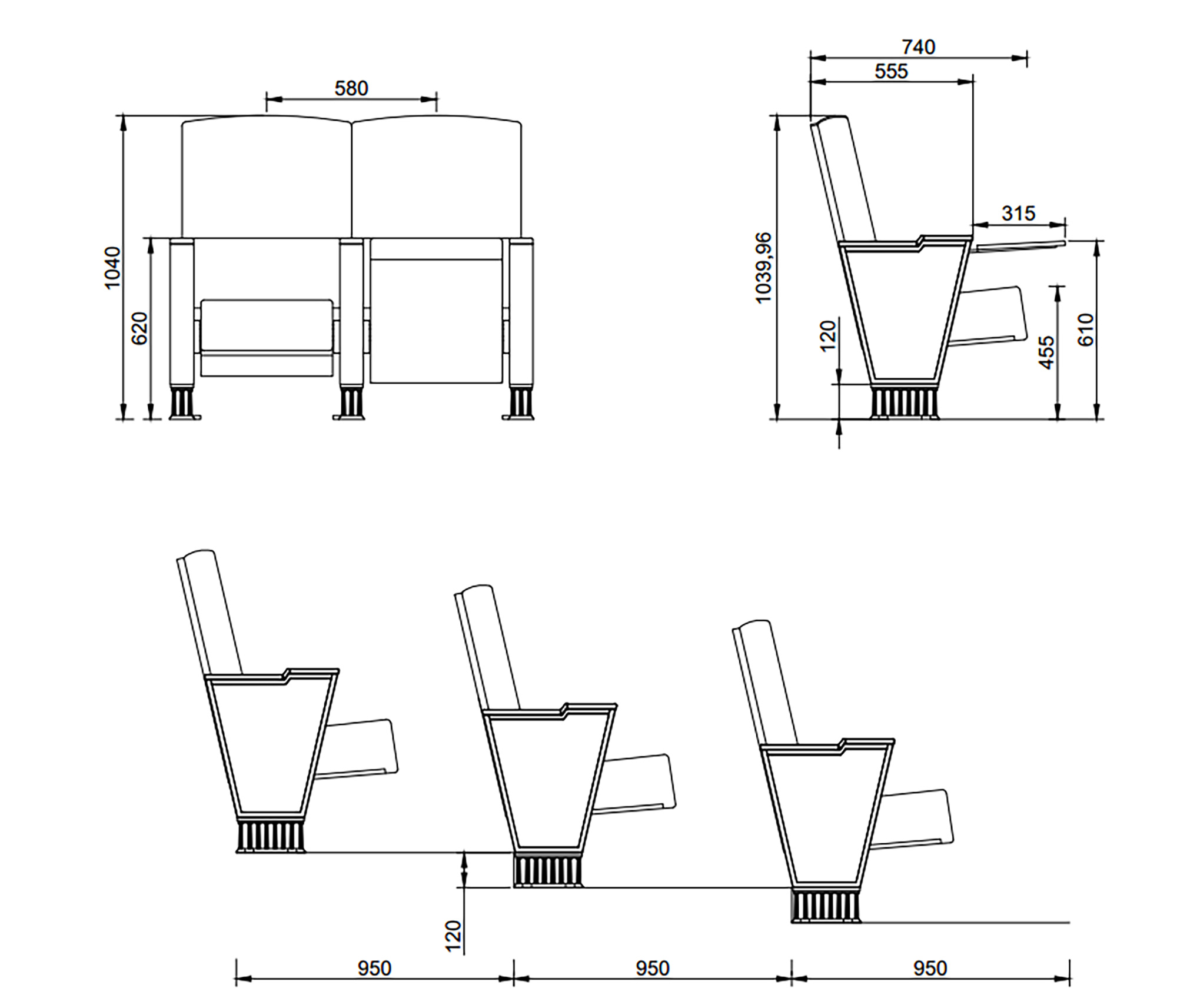 1.椅子總高度1050mm,連排座椅中心距離580mm,座面高度440mm;